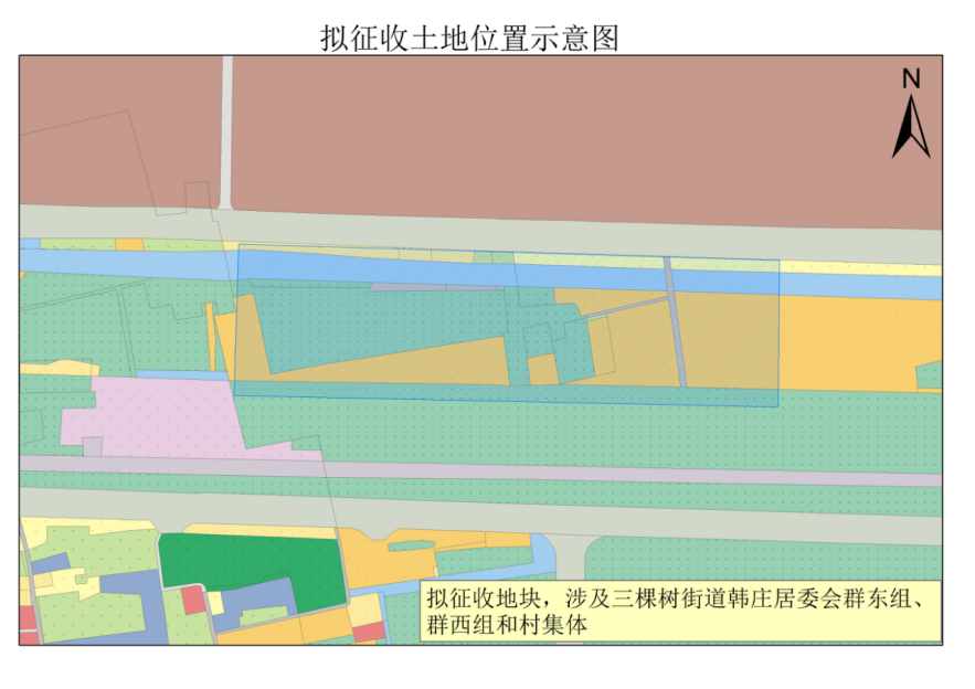 本次拟征收土地位于三棵树街道韩庄居委会群东组、群西组、村集体范围内。拟征收土地位置详见附图。