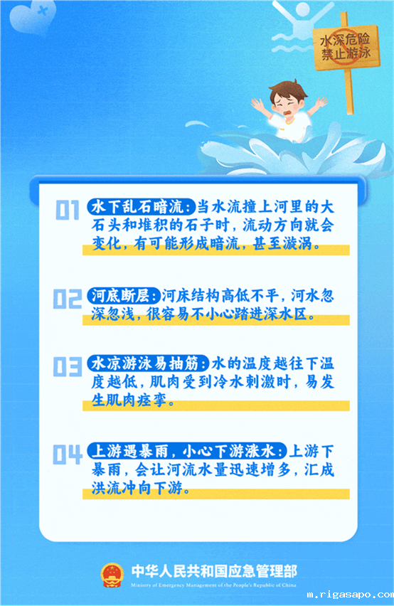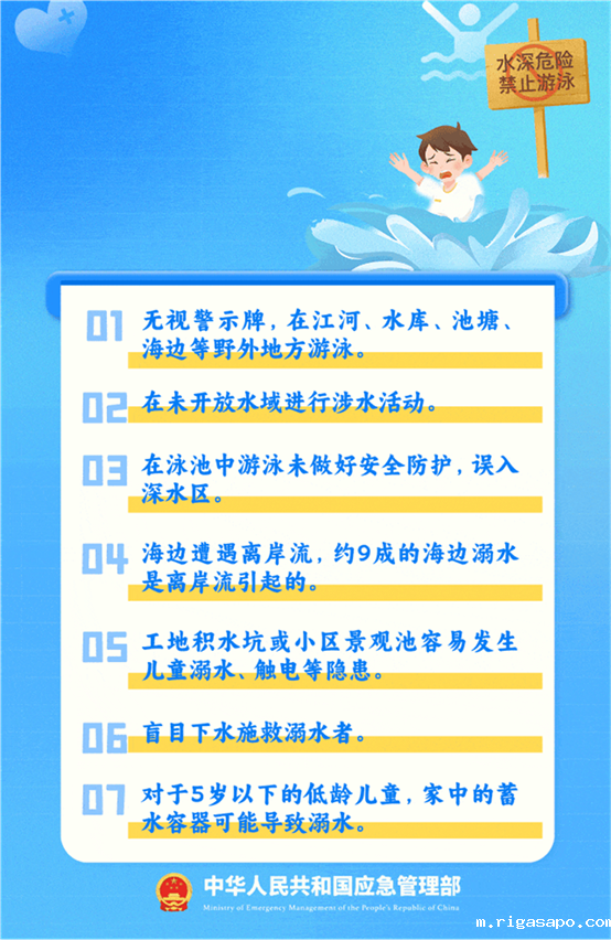 夏季是溺水事故的高发期,在此提醒大家:不要让孩子去游野泳,不要让孩子私自到水边玩耍 ,一定要牢记防溺水知识 ,时刻提高警惕 !