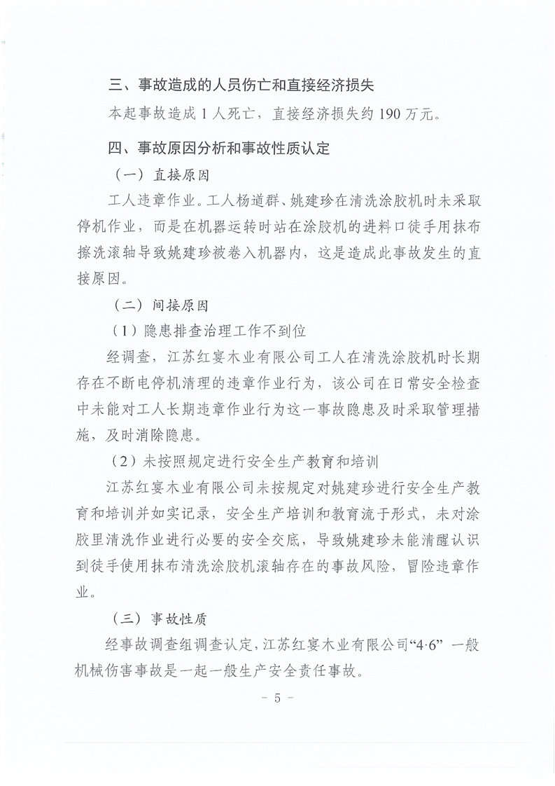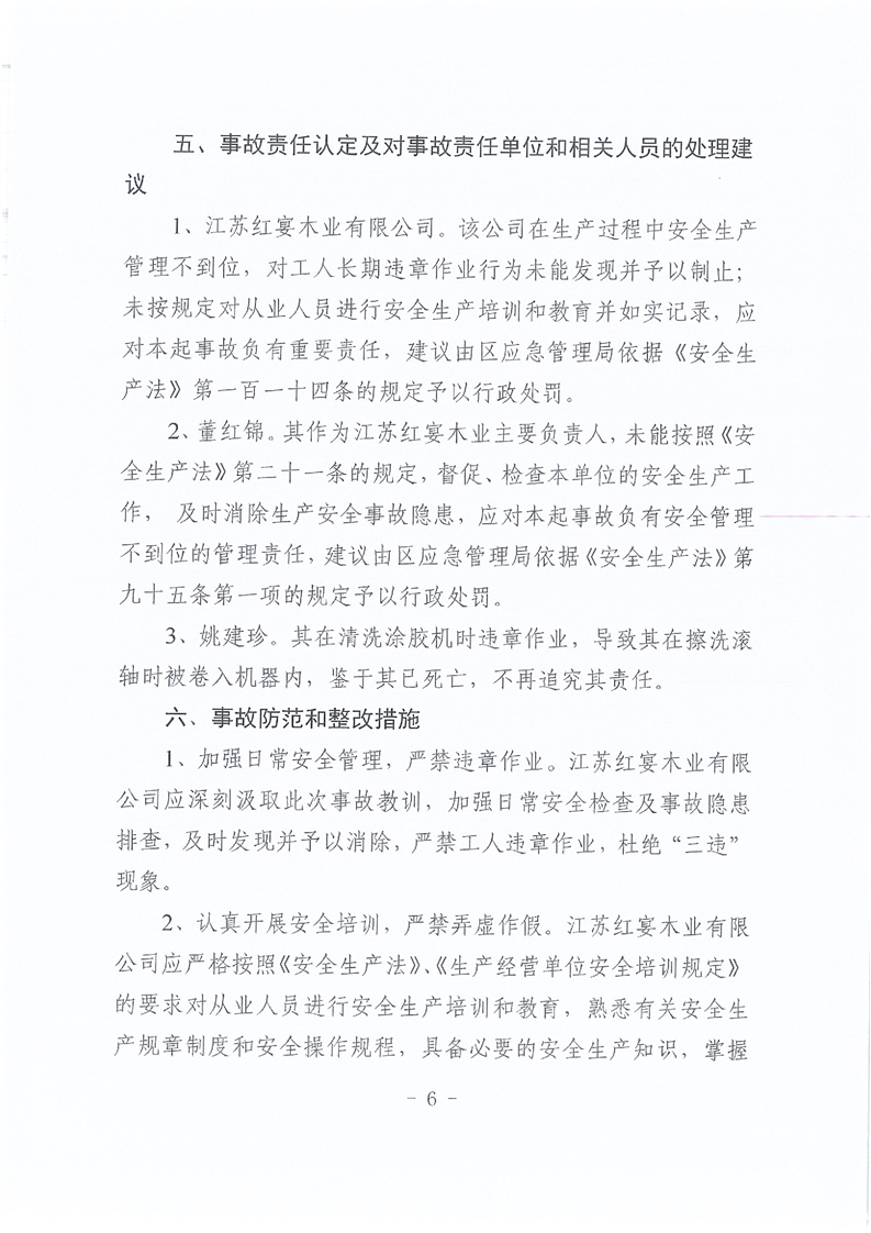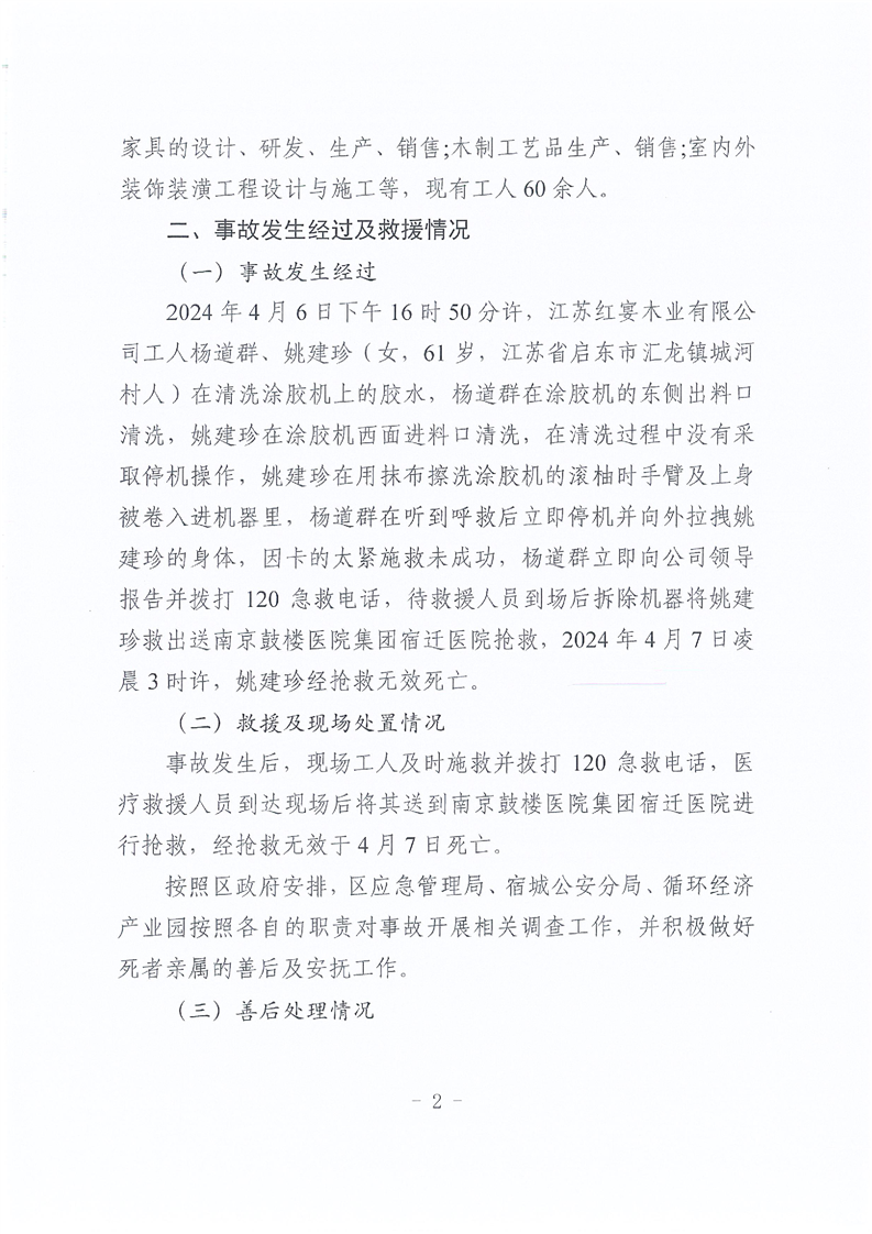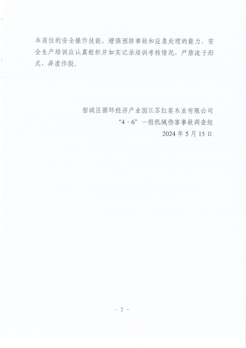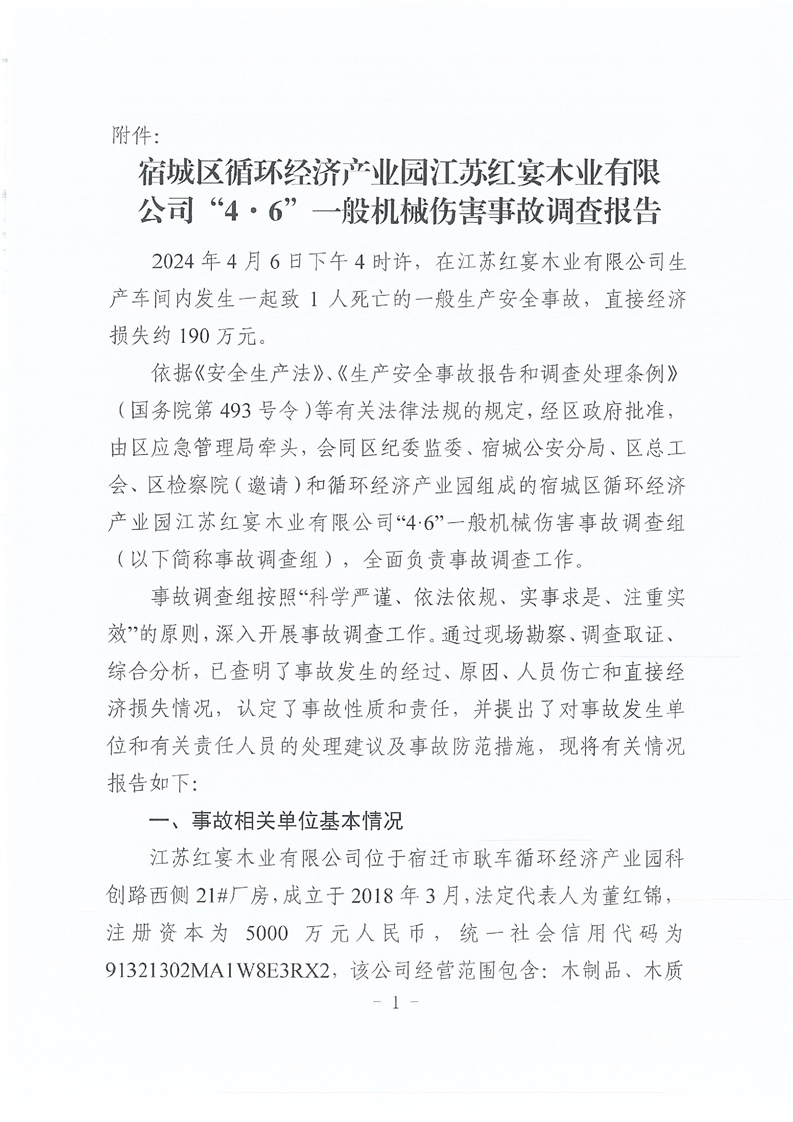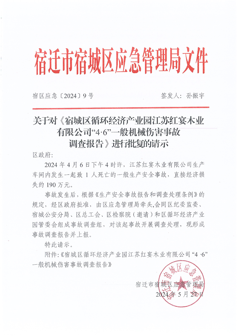 宿城区人民政府关于对《宿城区循环经济产业园江苏红宴木业有限公司“4·6”一般机械伤害事故调查报告》的批复