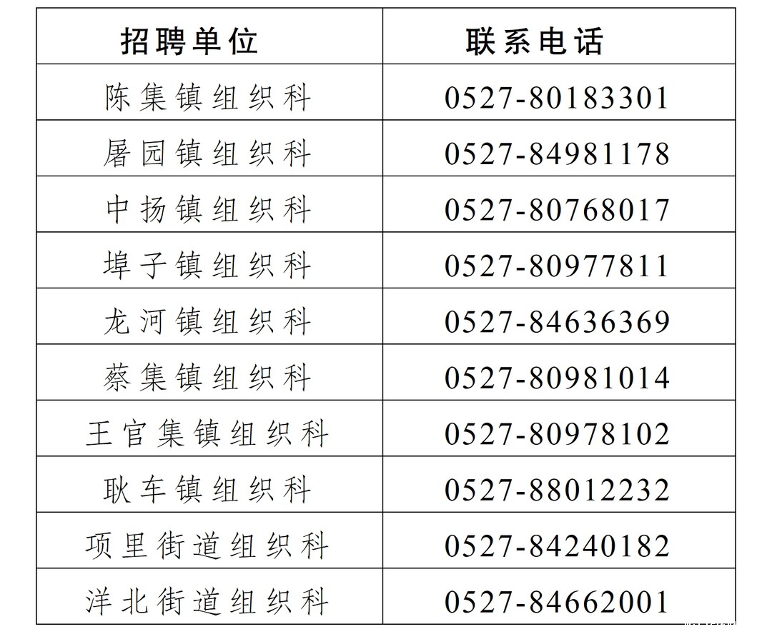陈集镇10名、屠园镇5名、中扬镇8名、埠子镇5名、龙河镇29名、蔡集镇10名、王官集镇10名、耿车镇6名、项里街道3名、洋北街道3名,采取挂职方式到村(社区)工作。招聘对象系中共党员的挂职村(社区)党组织副书记,系非中共党员的挂职村(居)民委员会副主任,参与工作分工,期限为2年。