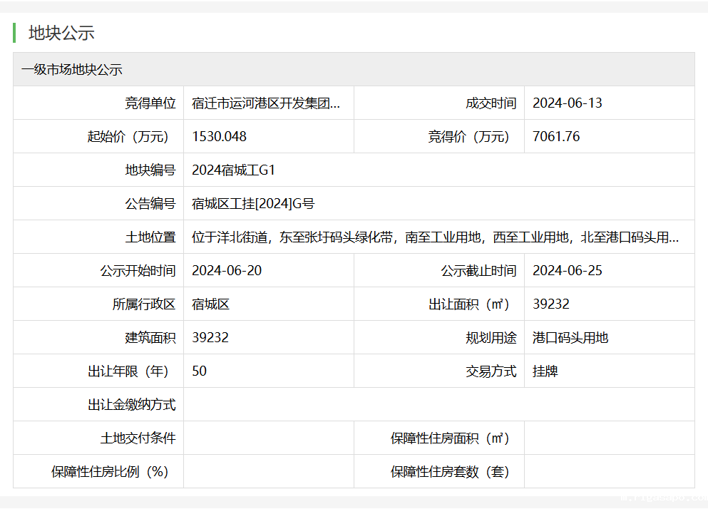 [国有土地使用权出让成交公示]宿迁市运河港区开发集团有限公司
