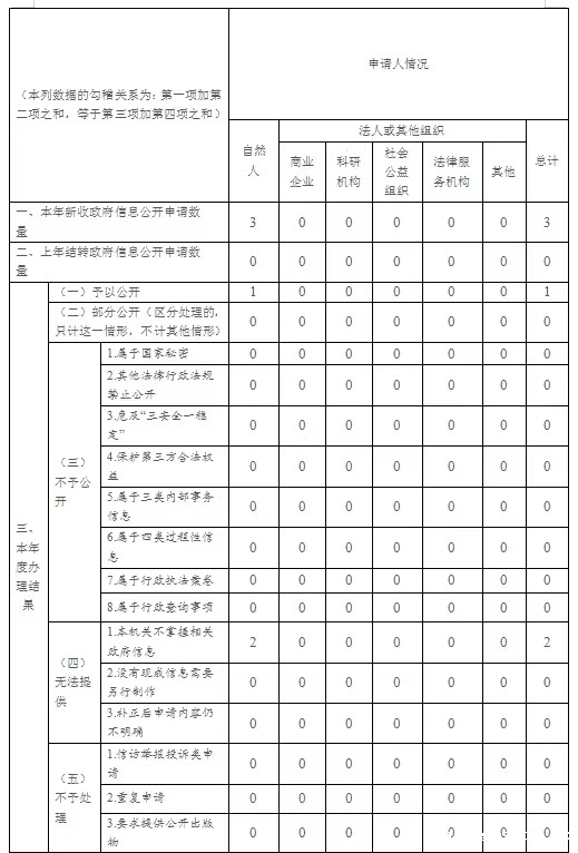 (三)规范依申请公开,持续规范案件办理。秉持依法有据、严谨规范原则做好依申请公开案件办理,确保程序规范,不断提高依法行政能力和水平。2023年度,我局共受理信息公开申请3件,已经回复完毕。2023年度我局无“不予公开”的政府信息。因政府信息公开工作被申请行政复议数量0件。因政府信息公开工作被申请行政诉讼数量0件。因政府信息公开工作被举报投诉数量0件。