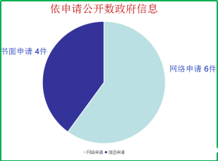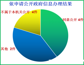 进一步完善政府信息公开指南,规范依申请公开受理、审查、处理、答复以及保存备查等环节,在“宿城在线”开设依申请公开接口,群众可通过“宿城在线”门户网站、电子邮件、书面信函、传真等方式提出申请。全年共收到政府信息公开申请10件,是2015年的5倍,其中网络申请6件,信函申请4件,均在规定时间内予以答复。其中“同意公开”4件,占总数40%;“不属于本行政机关公开”4件,占总数40%;“信息不存在或其他情况”2件,占总数20%。