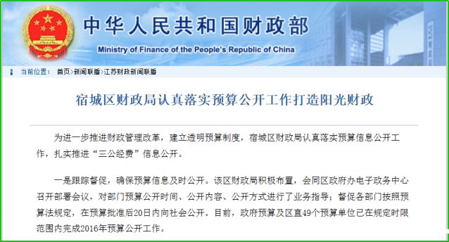 2、加强财政资金信息公开。认真落实财政预决算和“三公”经费公开要求,扩大部门预算公开范围,及时公开经区人大批准的预算、决算、预算执行情况。2016年,区级预决算公开实现区直部门全覆盖。按要求及时发布各类采购招标公告,在“宿城在线”共发布招标公告75条,中标公告34条。进一步加强区级财政专项资金管理和公开工作,建立专项资金定期公开制度,发布专项资金使用情况信息32条。